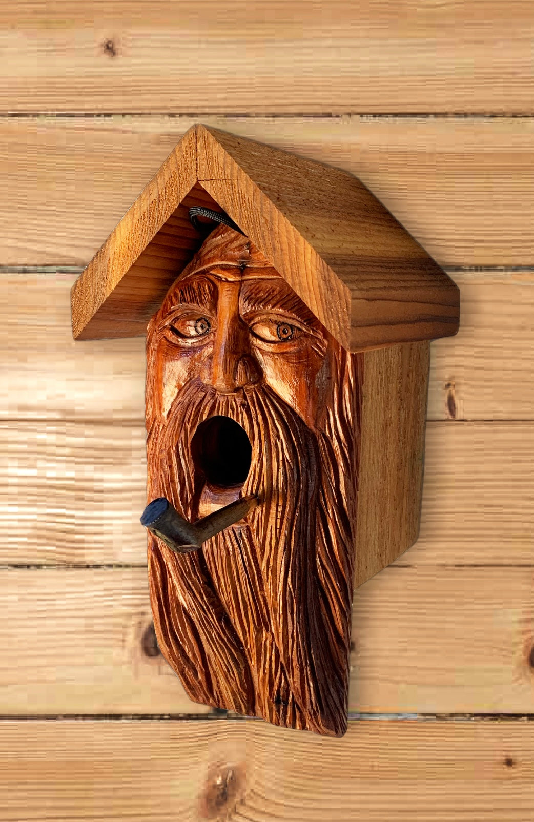 Hand carved birdhouse made from Cedar. 13”H x 7”W x 8”D. Opens for easy clean out.